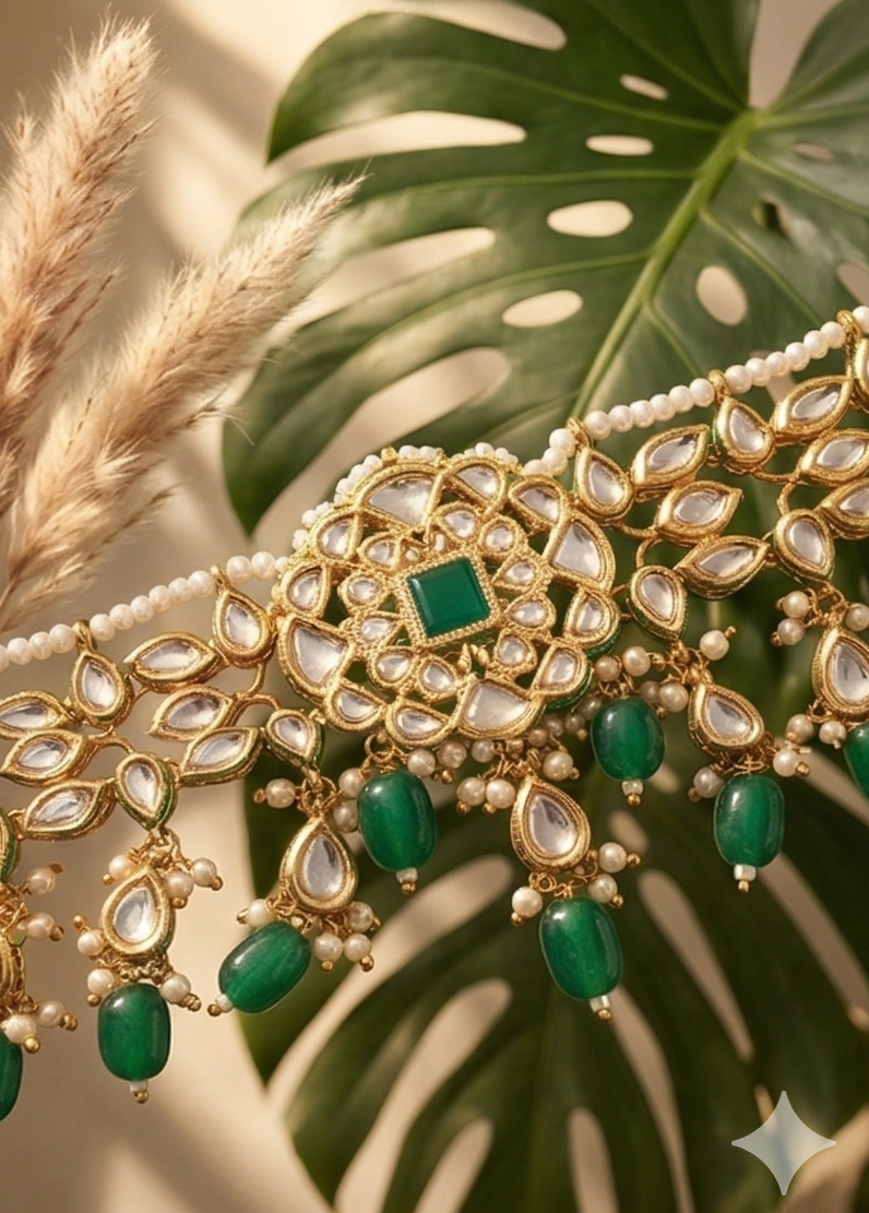 Materials: High-quality imitation Kundan stones, premium resin emerald-green beads, faux pearls, and a skin-friendly gold-plated alloy base.