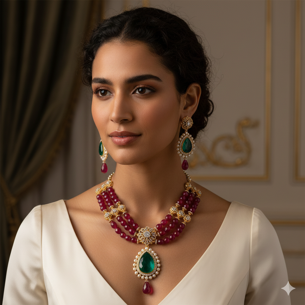 Handcrafted multi-layer ruby bead necklace set featuring an emerald-style centerpiece with matching earrings. A perfect blend of royal elegance and traditional craftsmanship.